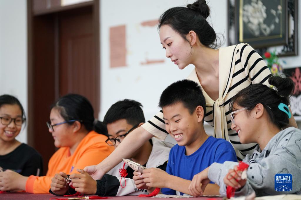 9月7日,在黑龍江撫遠市烏蘇鎮抓吉赫哲族村,尚美含指導孩子們制作赫哲族手工藝品。