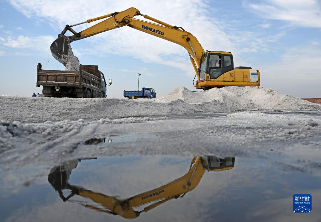 在天津長(cháng)蘆漢沽鹽場(chǎng),大型機械在鹽池中進(jìn)行扒鹽作業(yè)(9月14日攝)。
