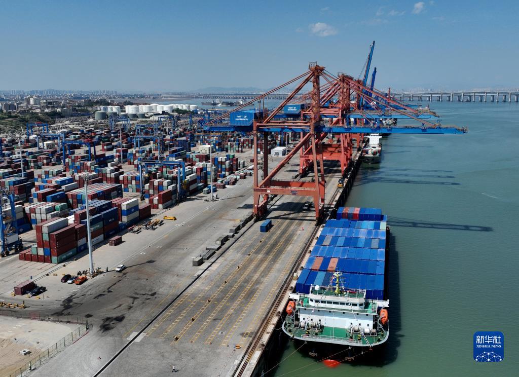 9月15日,停泊在泉州港石湖碼頭的“沃德菲寧波”號集裝箱輪準備啟航(無(wú)人機照片)。