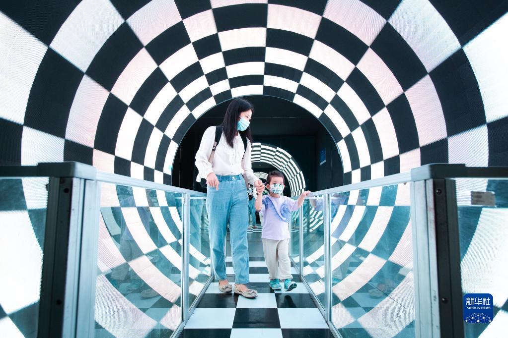 9月15日,家長(cháng)帶著(zhù)小朋友在南京科技館參觀(guān)體驗。