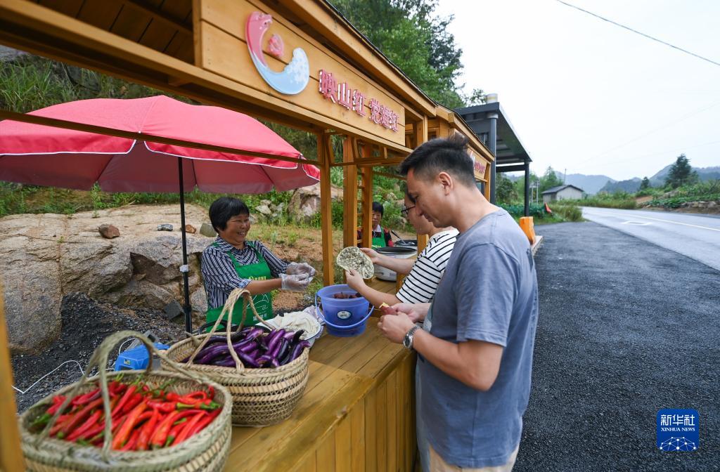 9月16日,杭州市臨安區龍崗鎮望湖村村民在村口的共享攤位擺賣(mài)時(shí)令蔬菜和當地土特產(chǎn)。