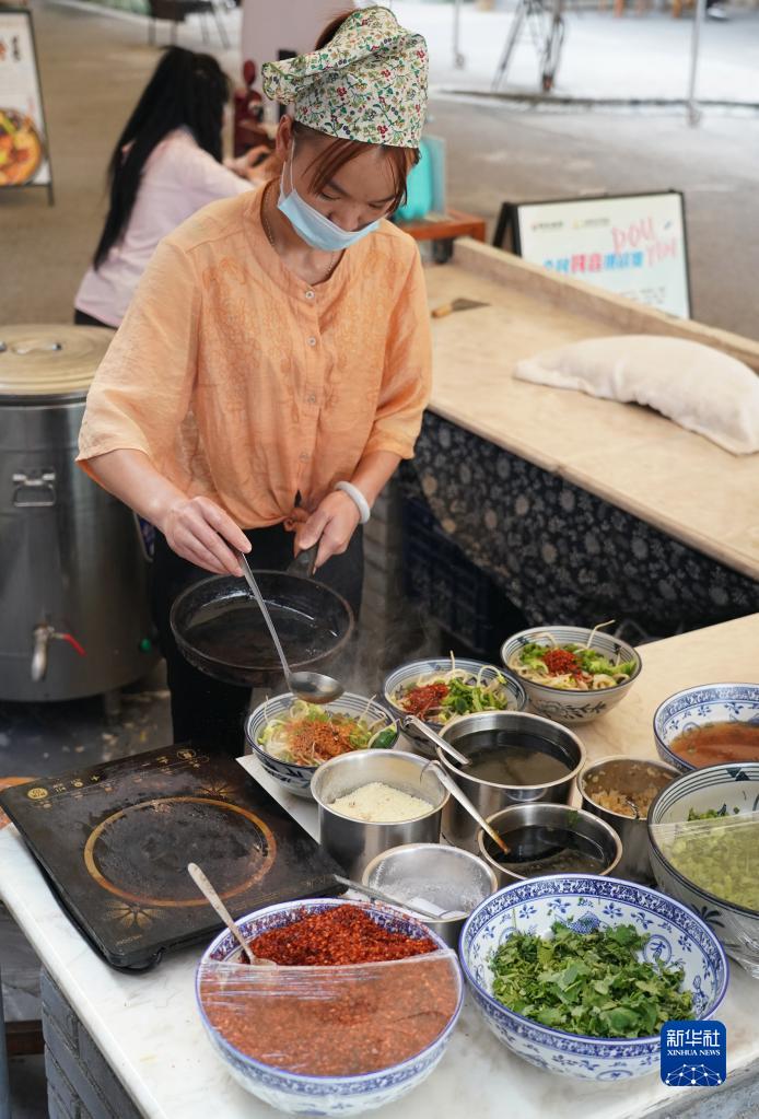 9月14日,在白鹿原影視城內,經(jīng)營(yíng)者李蒙蒙在制作油潑面。