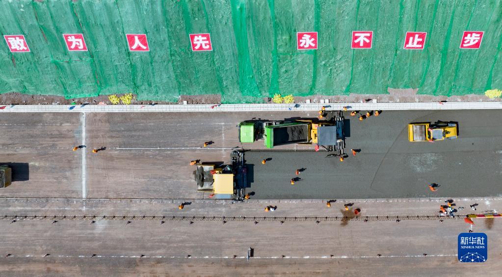 9月16日,來(lái)自中國能建葛洲壩路橋公司的建設者在武陽(yáng)高速黃石段施工(無(wú)人機照片)。