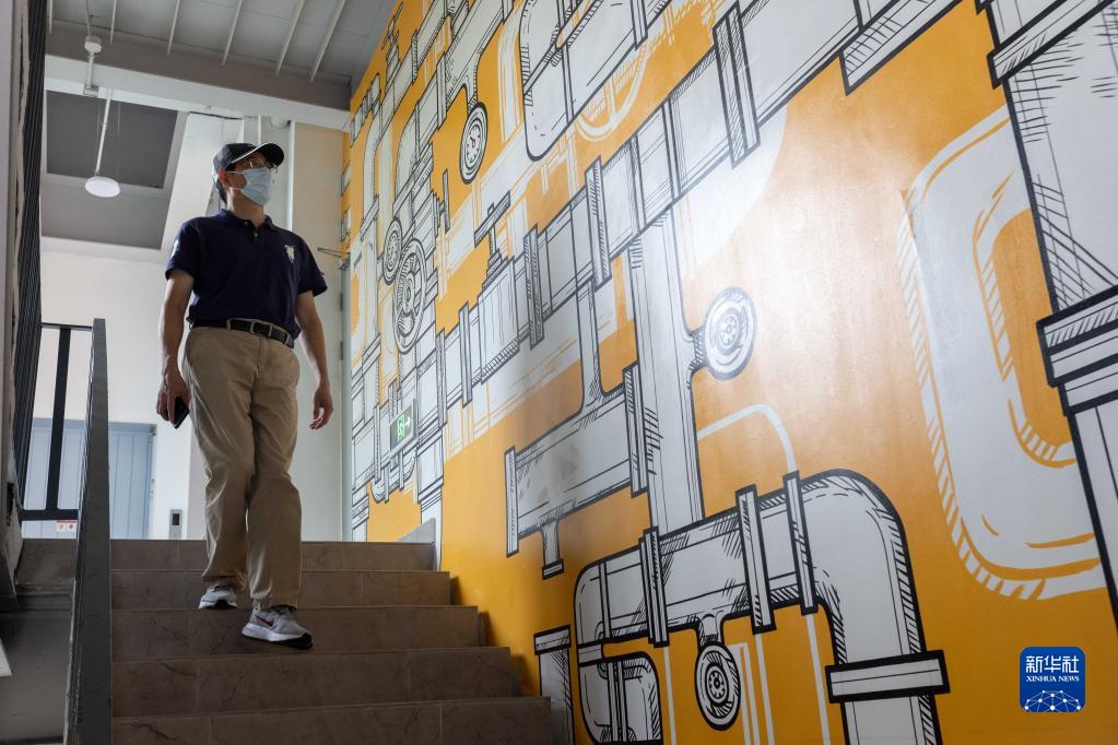9月16日,在蘇州河工業(yè)文明展示館,參觀(guān)者觀(guān)看樓梯旁布置的有工業(yè)文明特色的墻面。
