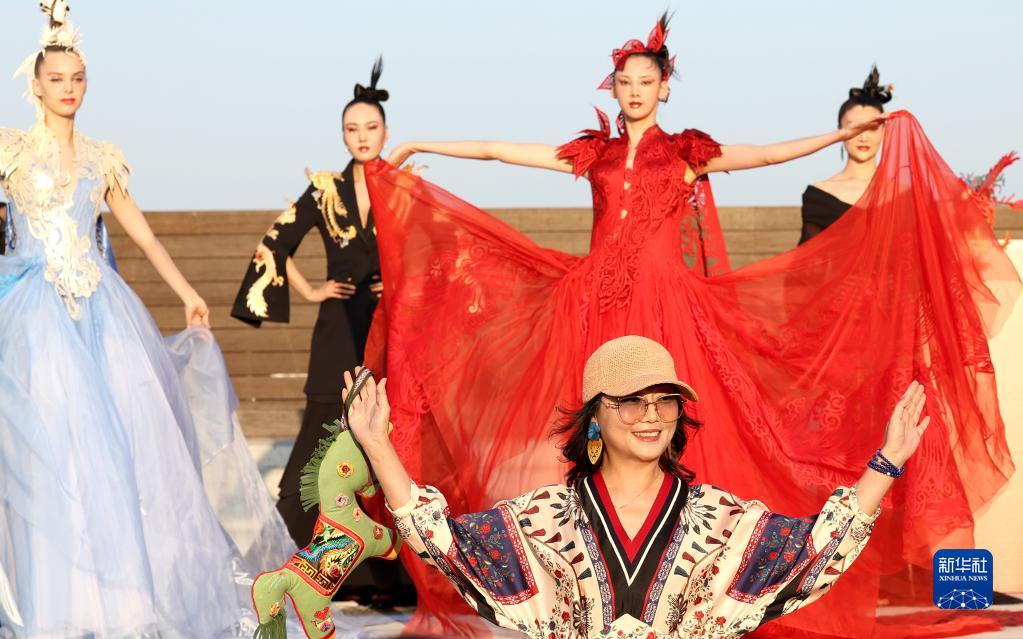 9月16日,知名時(shí)裝設計師劉薇(前)和模特在2022北京時(shí)裝周“劉薇非遺作品大賞”時(shí)裝秀上謝幕。