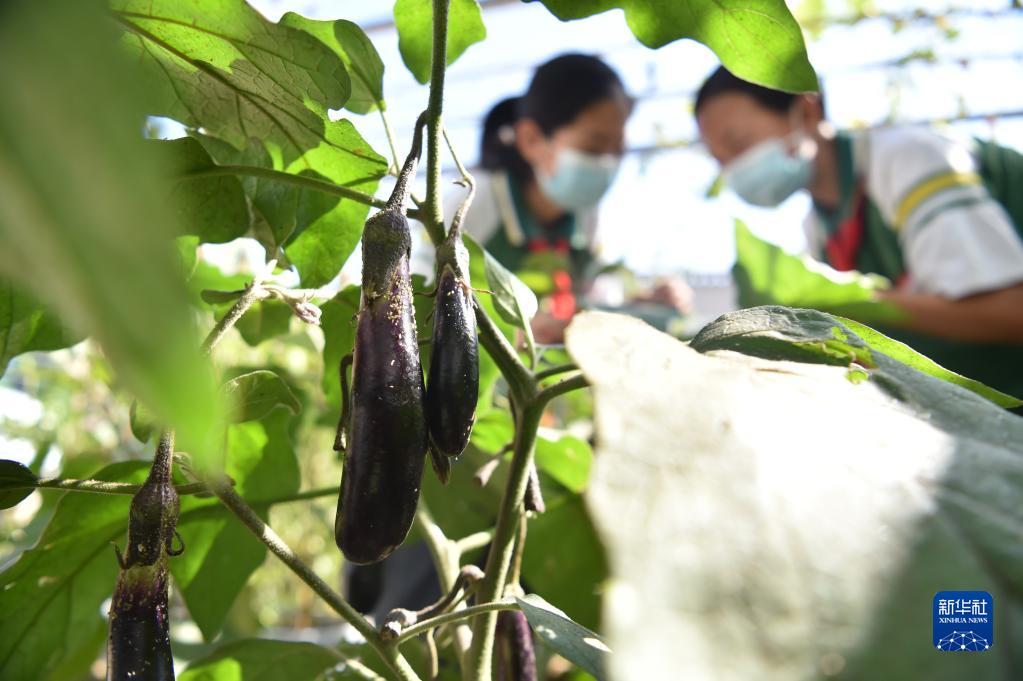 9月16日,在河北省石家莊市井陘孫莊育才學(xué)?!疤辗N子培育基地”,學(xué)生觀(guān)察航茄生長(cháng)情況。