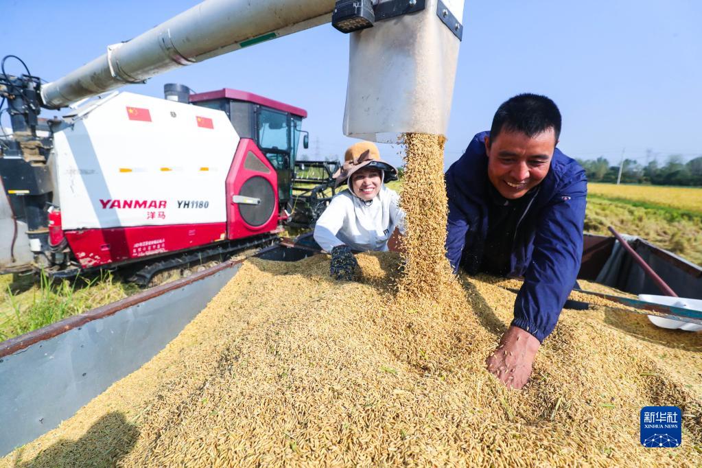 9月16日,河南省信陽(yáng)市光山縣寨河鎮耿寨村新生合作社社員在收割水稻。