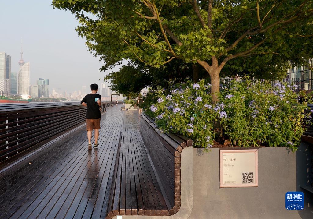 楊浦濱江長(cháng)椅邊的“建筑可閱讀”二維碼,向人們介紹歷史建筑故事和城市歷史記憶(2022年7月28日攝)。