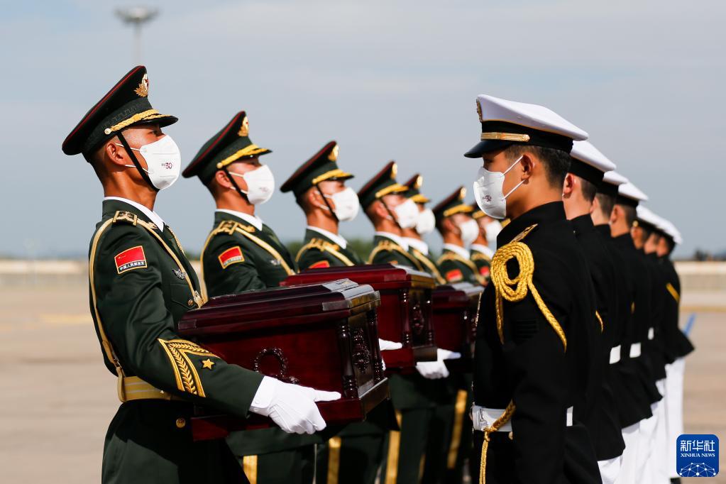 9月16日,在韓國仁川國際機場(chǎng),中國人民解放軍禮兵(左)從韓方接過(guò)中國人民志愿軍烈士棺槨。