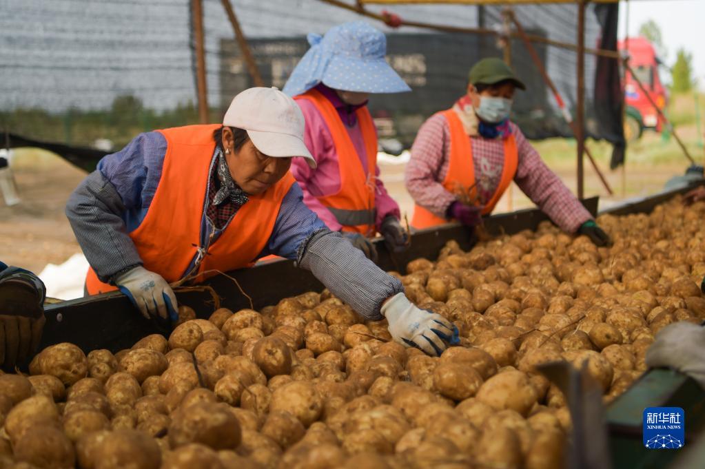 9月16日,工人在杭錦旗阿木古龍健康產(chǎn)業(yè)園內篩選土豆。