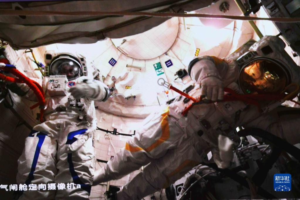 9月17日在北京航天飛行控制中心拍攝的神舟十四號航天員陳冬(左)、蔡旭哲結束出艙任務(wù)返回問(wèn)天實(shí)驗艙的畫(huà)面。