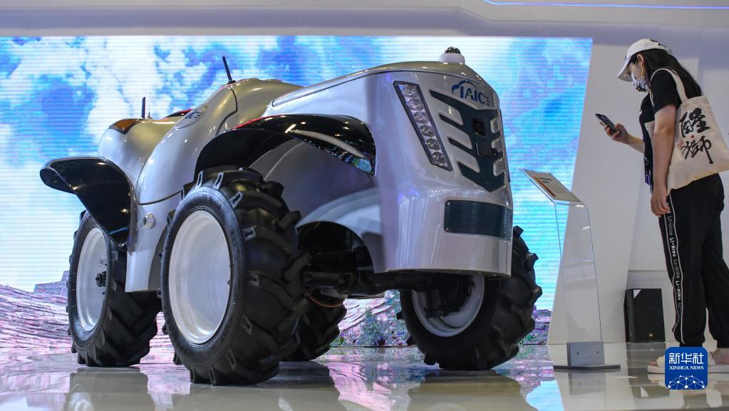 9月17日,一名參觀(guān)者在觀(guān)看一款無(wú)人駕駛拖拉機。