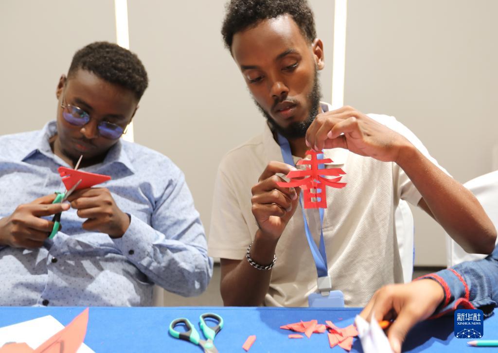 當日,在吉布提非洲青年創(chuàng )新創(chuàng )業(yè)中心,吉布提孔子學(xué)院老師為來(lái)自吉布提、埃賽俄比亞、肯尼亞、烏干達的非洲創(chuàng )業(yè)青年上了一堂生動(dòng)的中國文化課。風(fēng)俗、書(shū)法、剪紙等中國文化引起了學(xué)員們的廣泛興趣。