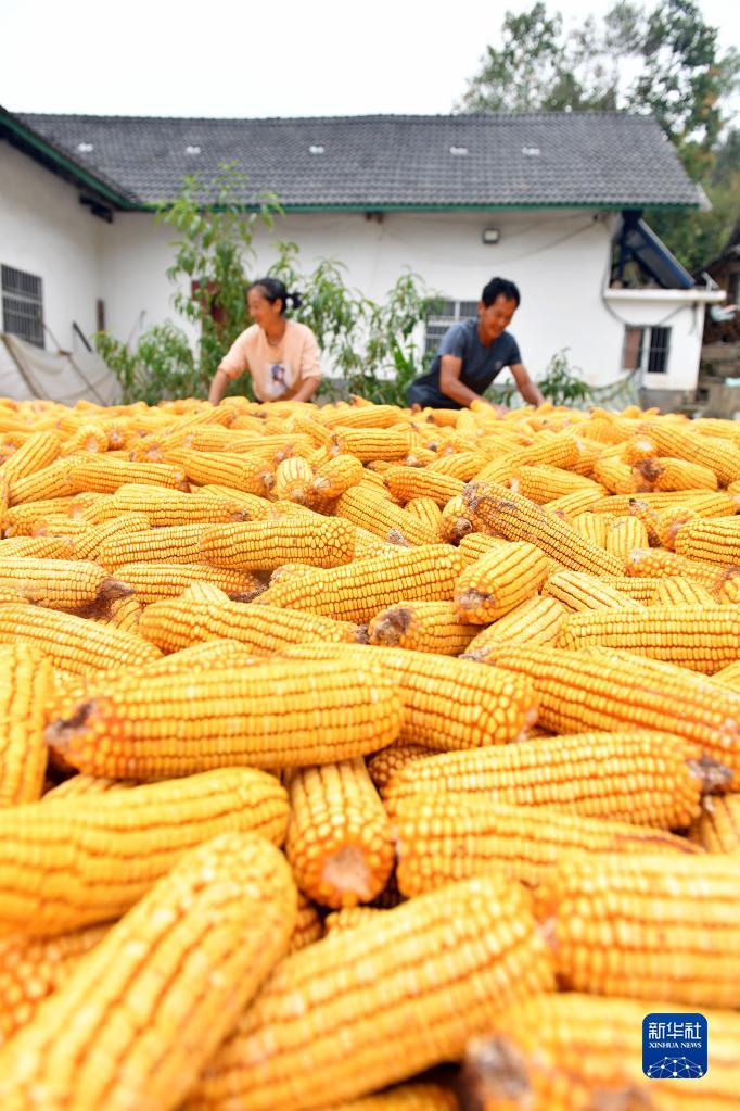 9月18日,湖北省宜昌市秭歸縣九畹溪鎮穿心店村的村民在自家曬臺上翻曬玉米。