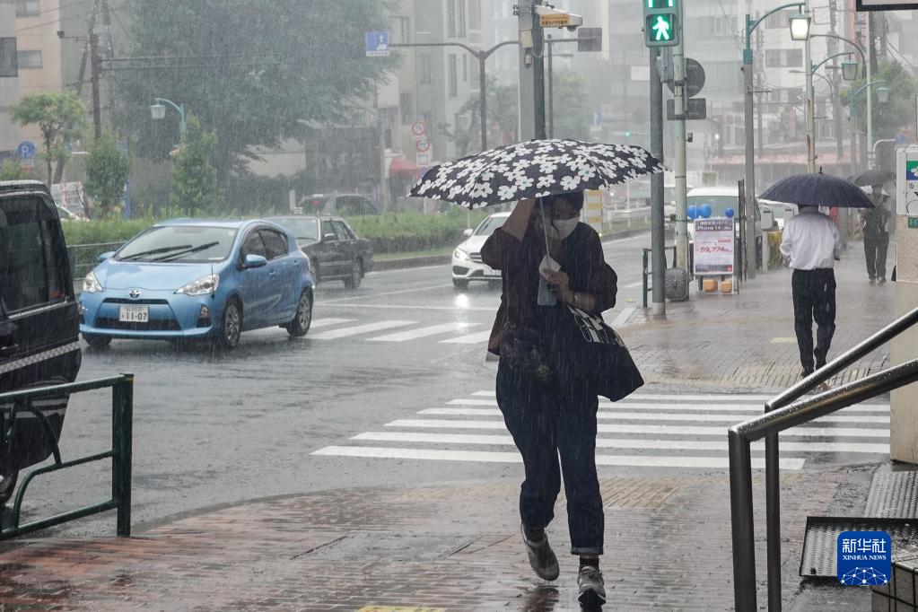 9月19日,行人在日本東京街頭冒雨前行。