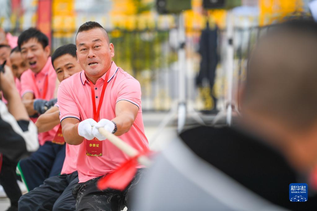 9月19日,人們在2022年內蒙古“中國農民豐收節”主會(huì )場(chǎng)慶豐收趣味運動(dòng)會(huì )上拔河。