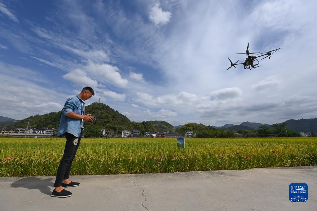 9月21日,在杭州市臨安區昌化鎮后營(yíng)村,種糧大戶(hù)汪強操作農用無(wú)人機給水稻施肥。汪強與家人承包了1000多畝稻田,使用現代化農用機械進(jìn)行規模種植。