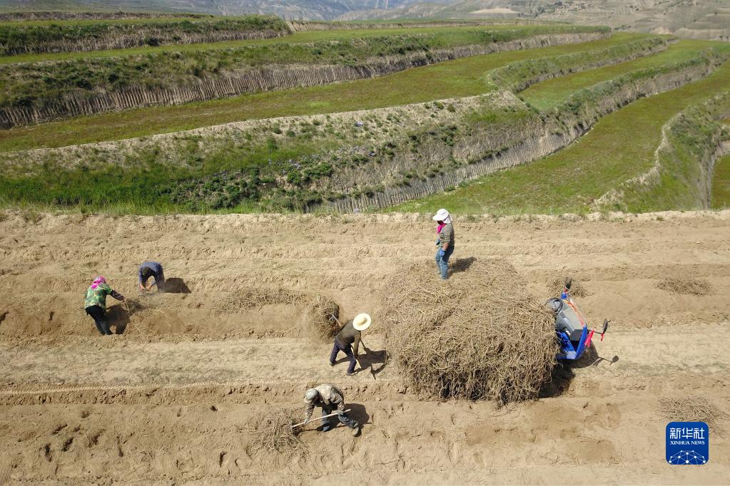 9月21日,農民在位于榆中縣貢井鎮的榆中宏鑫藥材專(zhuān)業(yè)合作社種植基地采收甘草(無(wú)人機照片)。