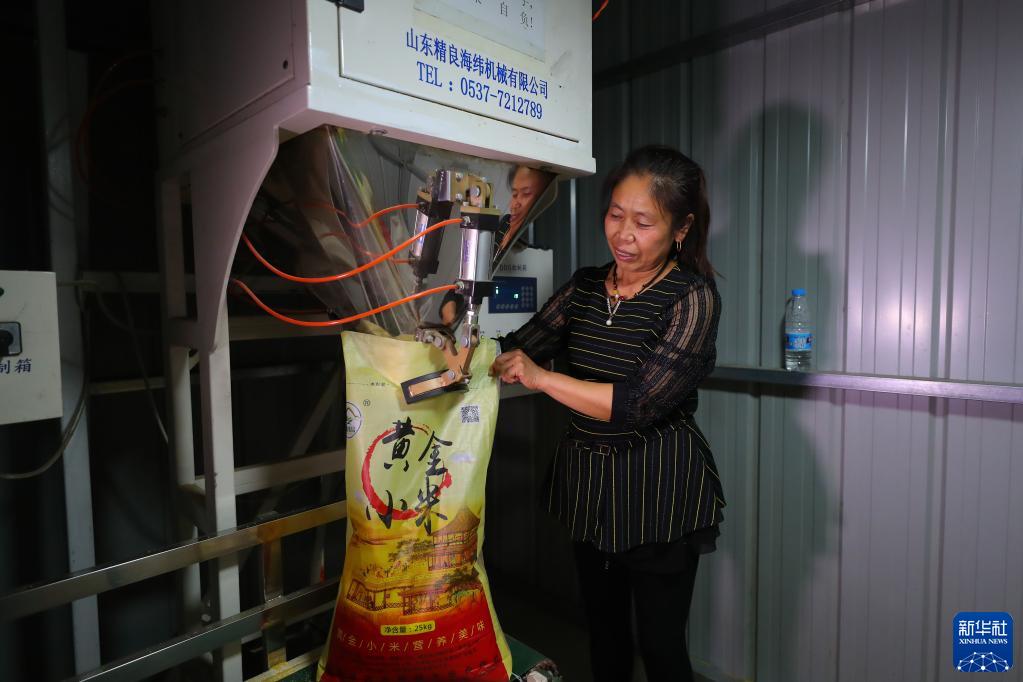 9月21日,在康平縣方家屯鎮東小陵村,農民在灌裝小米。