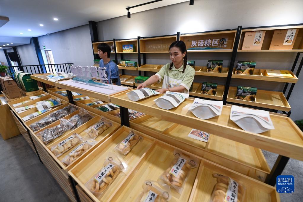9月22日,在由新鄉賢開(kāi)辦的杭州市富陽(yáng)區湖源鄉“村播學(xué)院”的特色農產(chǎn)品展廳內,工作人員整理農產(chǎn)品。