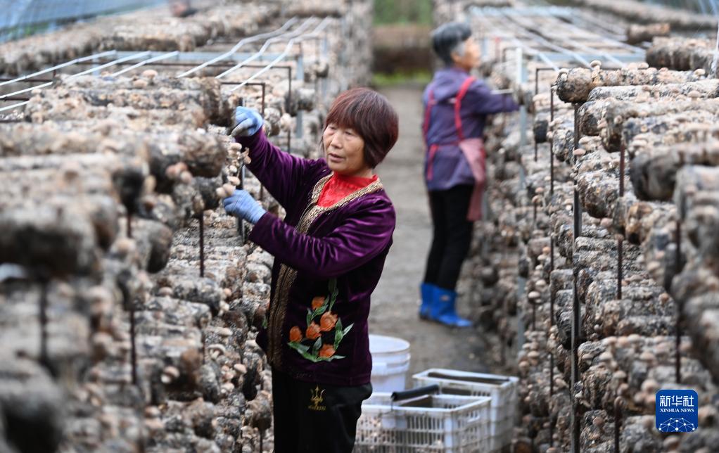 陜西漢中市城固縣桔園鎮陳家灣村村民在本村的股份經(jīng)濟合作社香菇大棚采摘香菇(9月20日攝)。食用菌與中藥材、茶葉已被列為漢中全市鄉村振興的支柱產(chǎn)業(yè)。