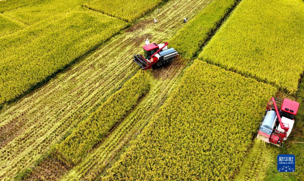 陜西漢中市洋縣戚氏街道八臘廟村村民在收獲水稻(9月10日攝,無(wú)人機照片)。近年來(lái),漢中市大力推進(jìn)“水稻增產(chǎn)擴能提質(zhì)示范工程”,水稻種植面積常年穩定在120萬(wàn)畝以上。