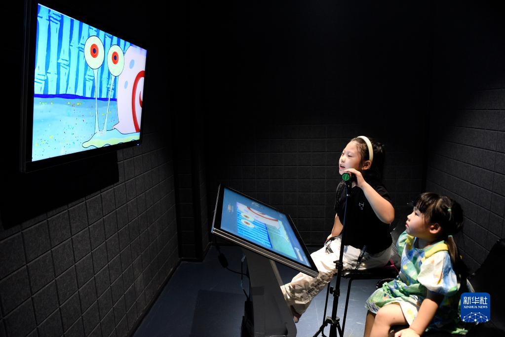 兩名兒童在西影電影藝術(shù)體驗中心為動(dòng)畫(huà)片配音(9月11日攝)。
