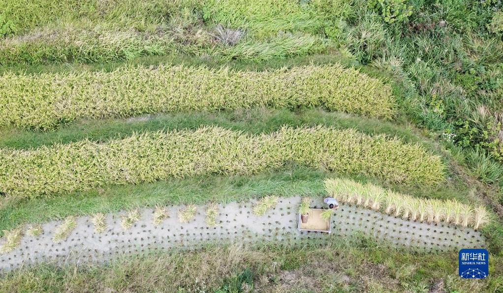 9月22日,村民在紫鵲界梯田勞作(無(wú)人機照片)。