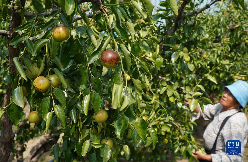 9月22日,在山東省濱州市沾化區下洼鎮的大棚冬棗種植園,棗農在采摘成熟的冬棗。