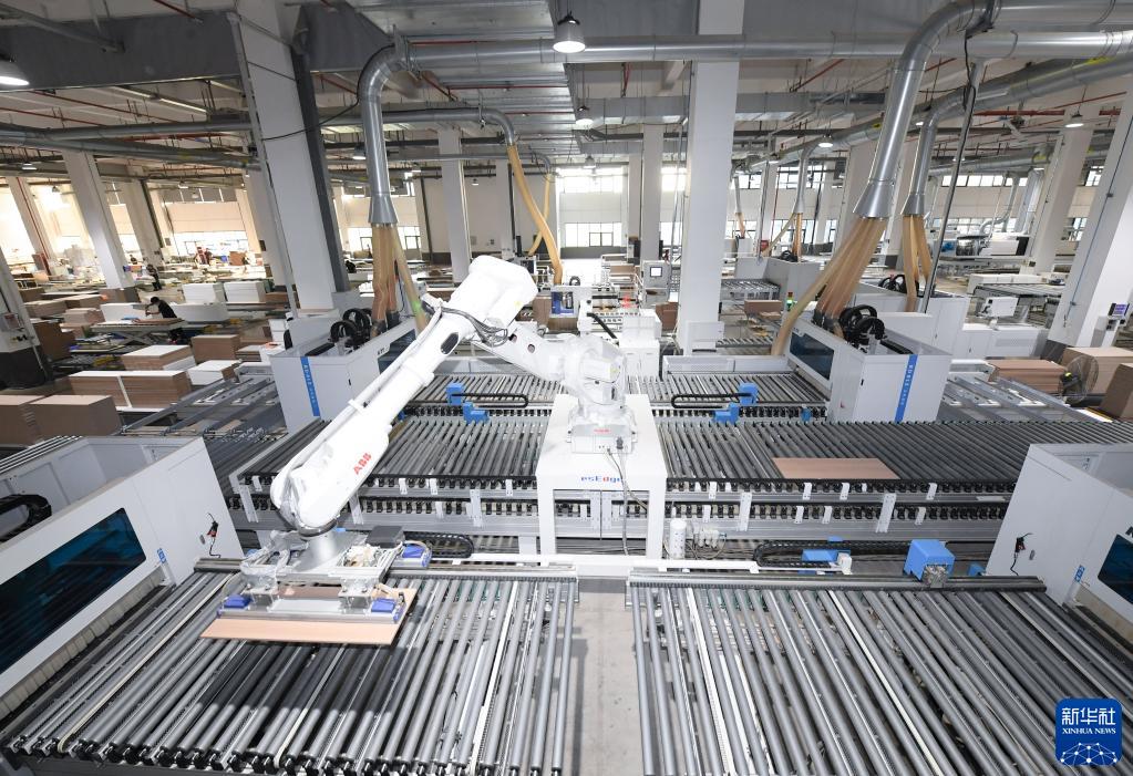 9月22日,在位于安吉縣的樂(lè )捷家居股份有限公司,機械臂在智能家具鉆孔工作站分放板材。