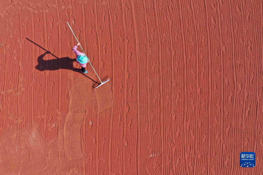 9月5日,貴州省開(kāi)陽(yáng)縣永溫鎮雙河村村民在晾曬高粱(無(wú)人機照片)。