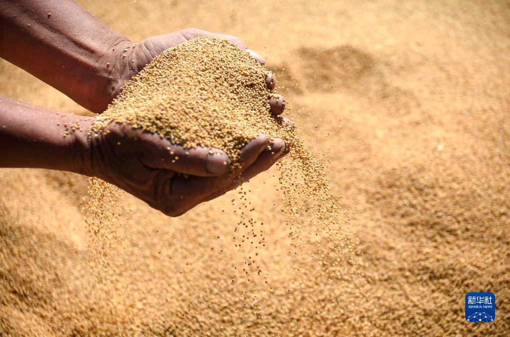 9月2日,在山東省淄博市沂源縣悅莊鎮西鮑莊村,農民觀(guān)察脫粒后的谷子成色。