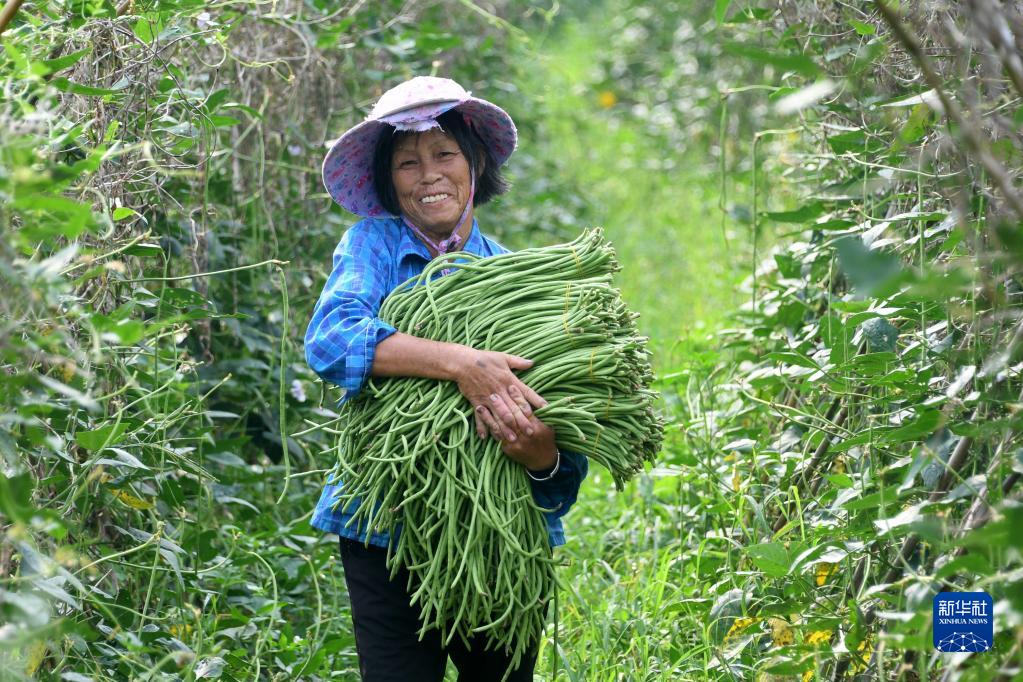 9月22日,在廣西河池市羅城仫佬族自治縣黃金鎮寺門(mén)村,農民在采收豇豆。