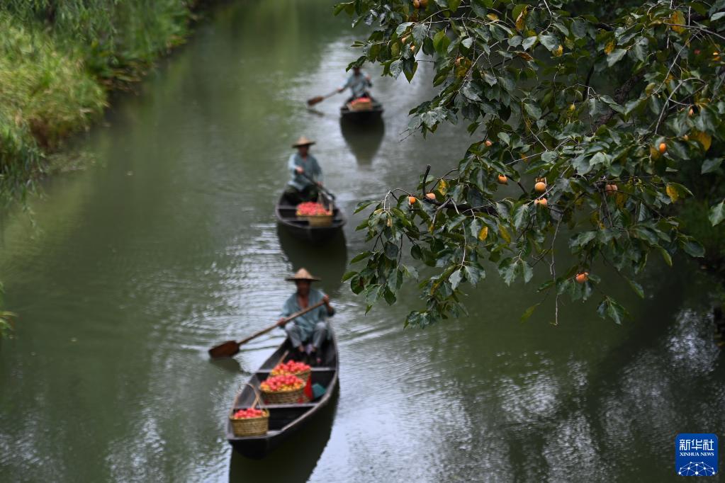 9月23日,西溪濕地的工作人員用船運送剛采摘的柿子。