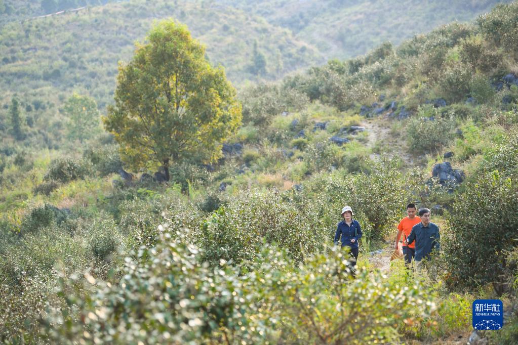 9月21日,在廣東韶關(guān)樂(lè )昌市梅花鎮流山村,白拉曲珍(左)和師傅江建發(fā)(右)、同事伍國清來(lái)到石漠化綜合治理的油茶種植基地查看油茶生長(cháng)情況。