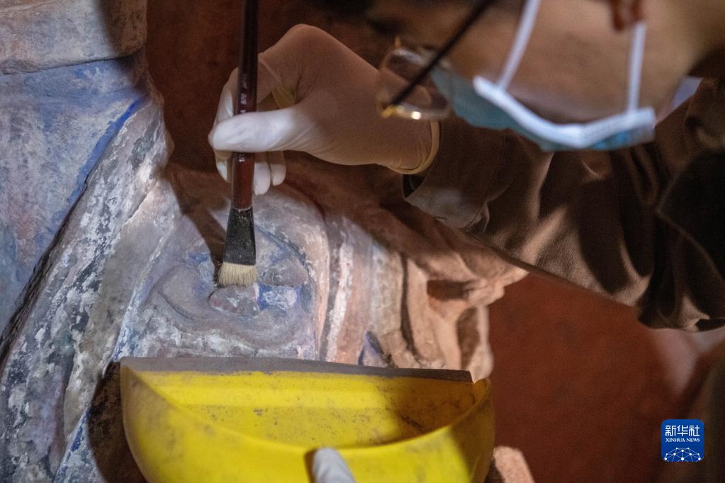 9月22日,大足石刻研究院保護工程中心的工作人員對舒成巖摩崖造像進(jìn)行本體修復。