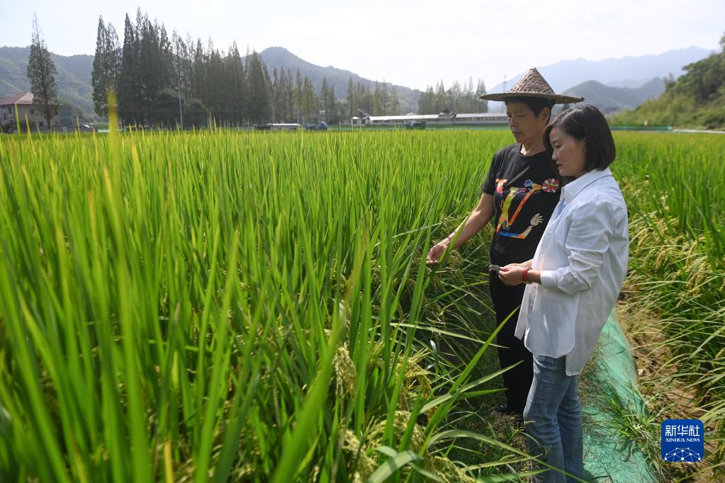 9月24日,在太陽(yáng)鎮太陽(yáng)米稻田基地,基地負責人陳梅芳(右)在指導農戶(hù)稻蛙養殖。在她的牽頭下,太陽(yáng)鎮推廣稻蛙共養水稻約500畝,每畝可額外增加6000元收入。
