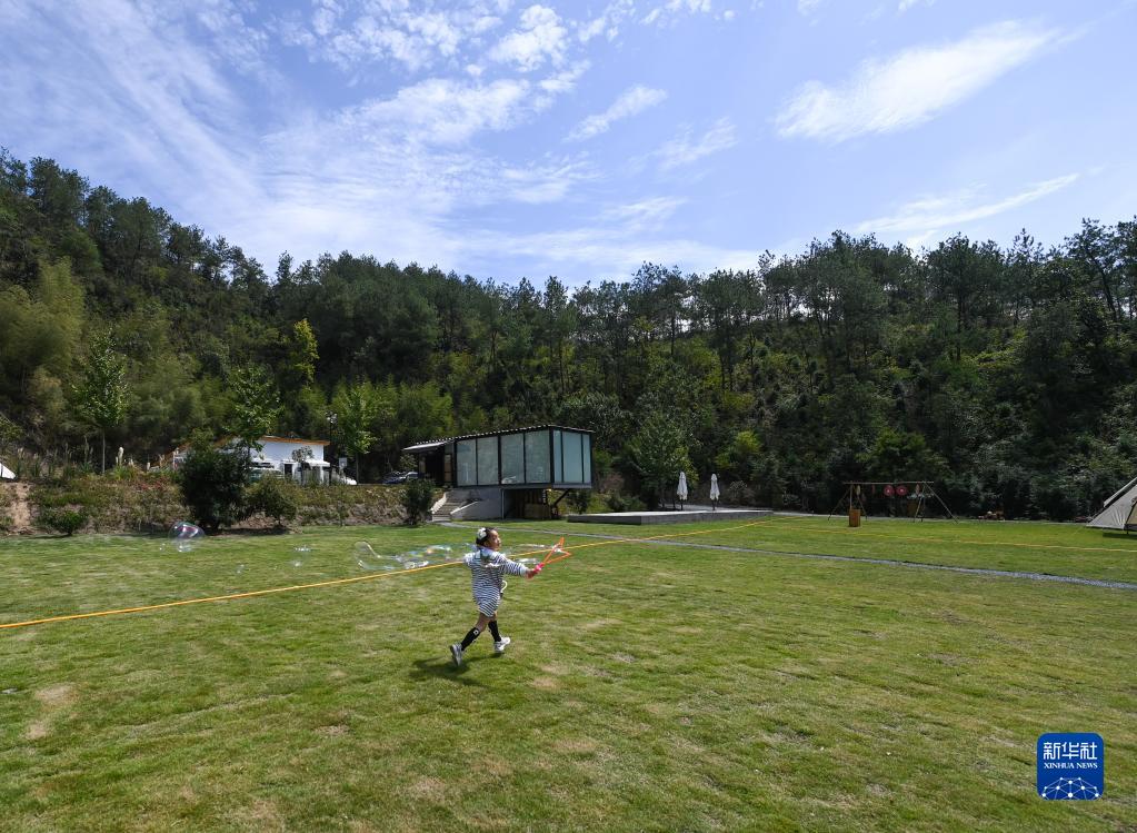 9月24日,一名小朋友在杭州市臨安區太陽(yáng)鎮上莊村的牧光谷露營(yíng)基地玩耍。該基地是2022年5月剛投入運營(yíng)的網(wǎng)紅露營(yíng)基地,帶動(dòng)周邊30余名農戶(hù)就業(yè)。