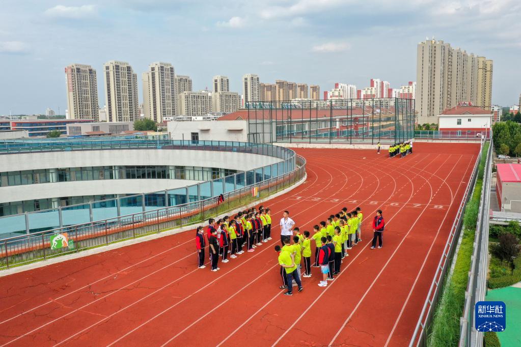 9月20日,齊河縣第六小學(xué)學(xué)生在空中運動(dòng)場(chǎng)上體育課(無(wú)人機照片)。這所地處鬧市的學(xué)校將地下停車(chē)、地上教學(xué)、運動(dòng)場(chǎng)地分層穿插布局巧妙融合,節地率達到54%。