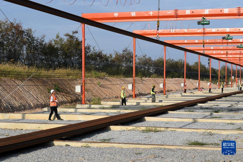 9月24日,在中鐵十一局池黃鐵路鋪軌基地,工作人員進(jìn)行卸軌作業(yè)。