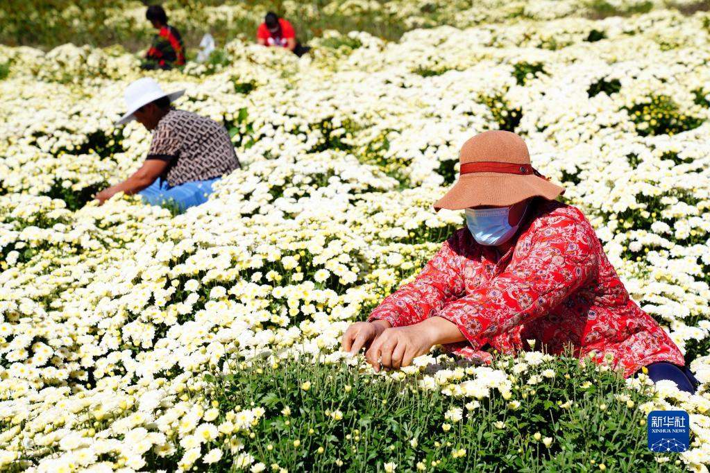9月23日,在惠民縣姜樓鎮誠至農牧專(zhuān)業(yè)合作社,村民在采摘北京菊。