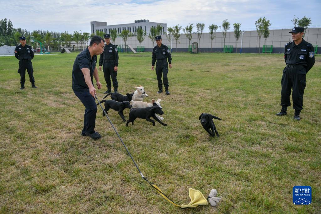 9月20日,訓導員李新(前)帶領(lǐng)幼犬活動(dòng)。