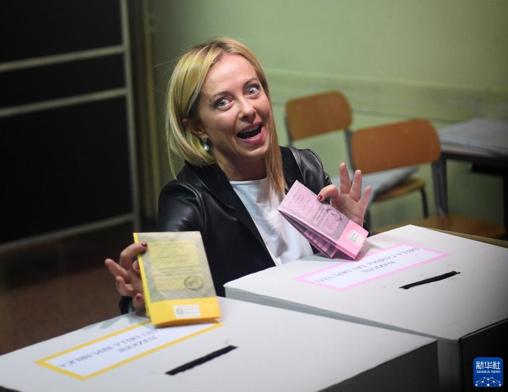 9月25日,意大利兄弟黨黨首喬治婭·梅洛尼在羅馬一處投票站展示選票。