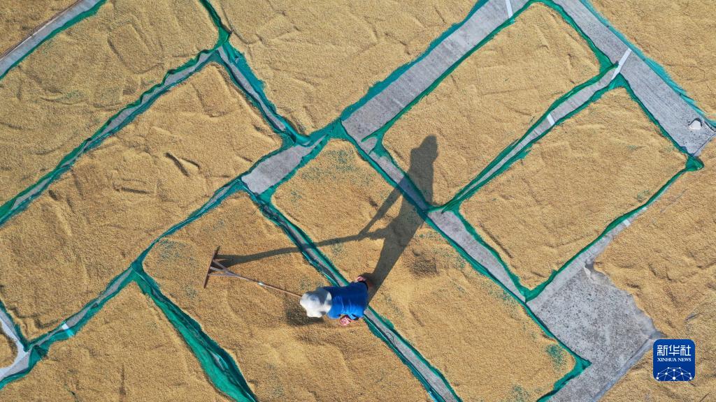 9月26日,貴州省黔東南苗族侗族自治州劍河縣革東鎮光條村村民在晾曬稻谷(無(wú)人機照片)。