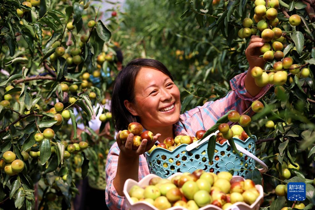 9月26日,在河南省駐馬店市驛城區香山辦事處扶貧產(chǎn)業(yè)基地天中生態(tài)園,農戶(hù)采摘成熟的冬棗。