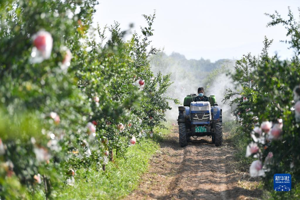 9月26日,工作人員在位于西安市臨潼區的石榴紅生態(tài)科技園駕駛農機對石榴噴灑酵素肥料。