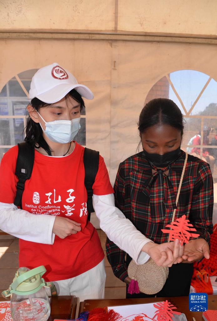 9月27日,塔那那利佛大學(xué)孔子學(xué)院的師生們一起表演剪紙。