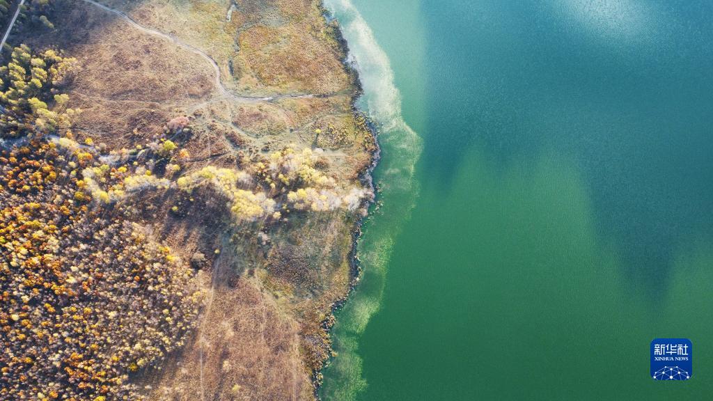 9月28日拍攝的扎蘭屯市柴河鎮同心天池秋日風(fēng)光(無(wú)人機照片)。