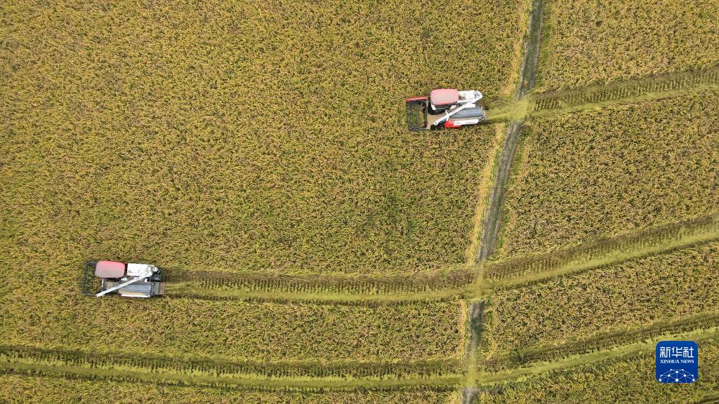 9月28日,合肥市肥西縣花崗鎮河豐社區村民駕駛收割機收獲中稻(無(wú)人機照片)。