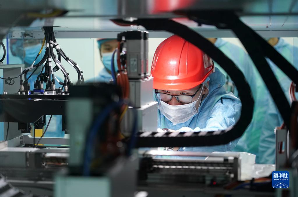 9月28日,工人在隆基綠能15GW高效單晶電池項目車(chē)間內調試設備。